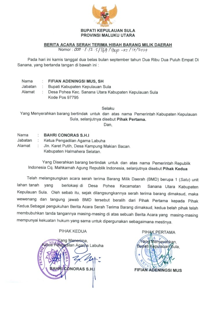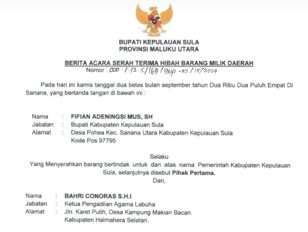 Menurut Basiludin, hibah lahan tersebut telah resmi dilakukan sejak tahun 2024. Hal itu ditandai dengan penandatanganan Naskah Perjanjian Hibah Daerah (NPHD) oleh Bupati Kepulauan Sula, Fifian Adeningsih Mus, bersama Bahri Conoras, S.Hi, yang mewakili Mahkamah Agung Republik Indonesia.