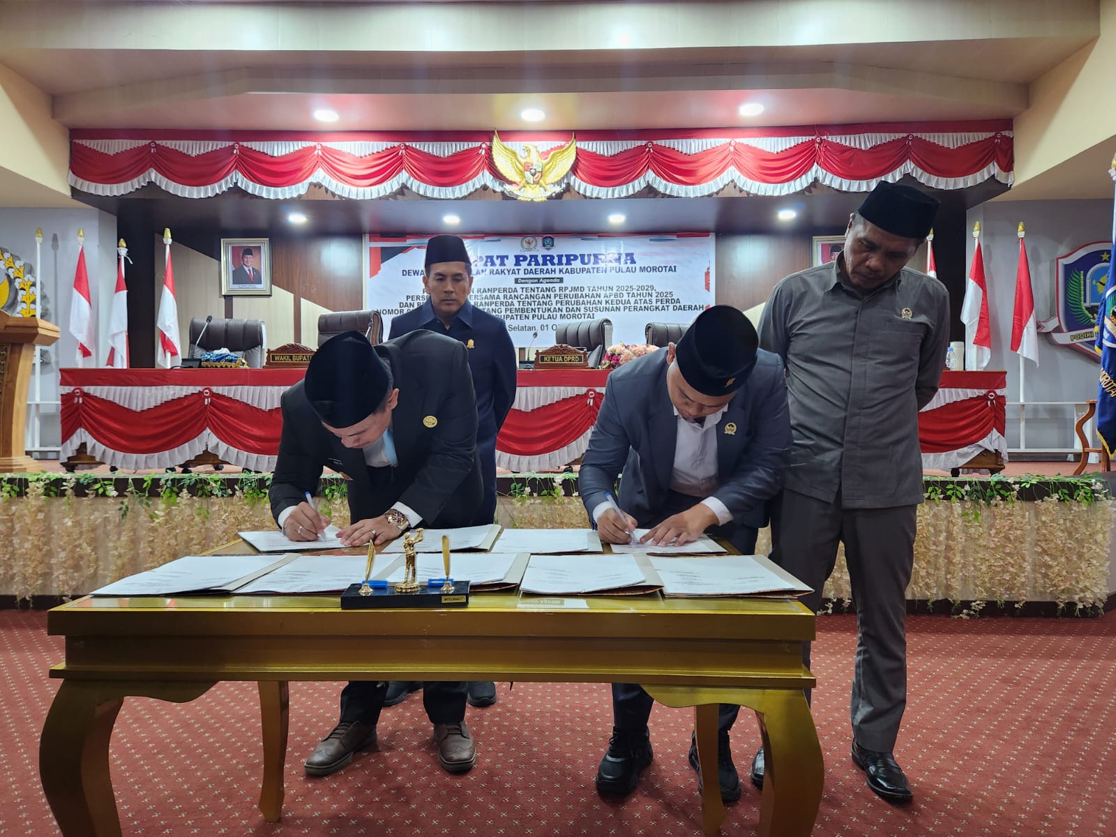 Paripurna dipimpin Ketua DPRD Muhamad Rizky, didampingi Wakil Ketua I Jainudin Papala dan Wakil Ketua II Erwin Sutanto. Hadir pula Wakil Bupati Morotai Rio Christina Pawane, Sekda Muhammad Umar Ali, serta unsur Forkompimda.