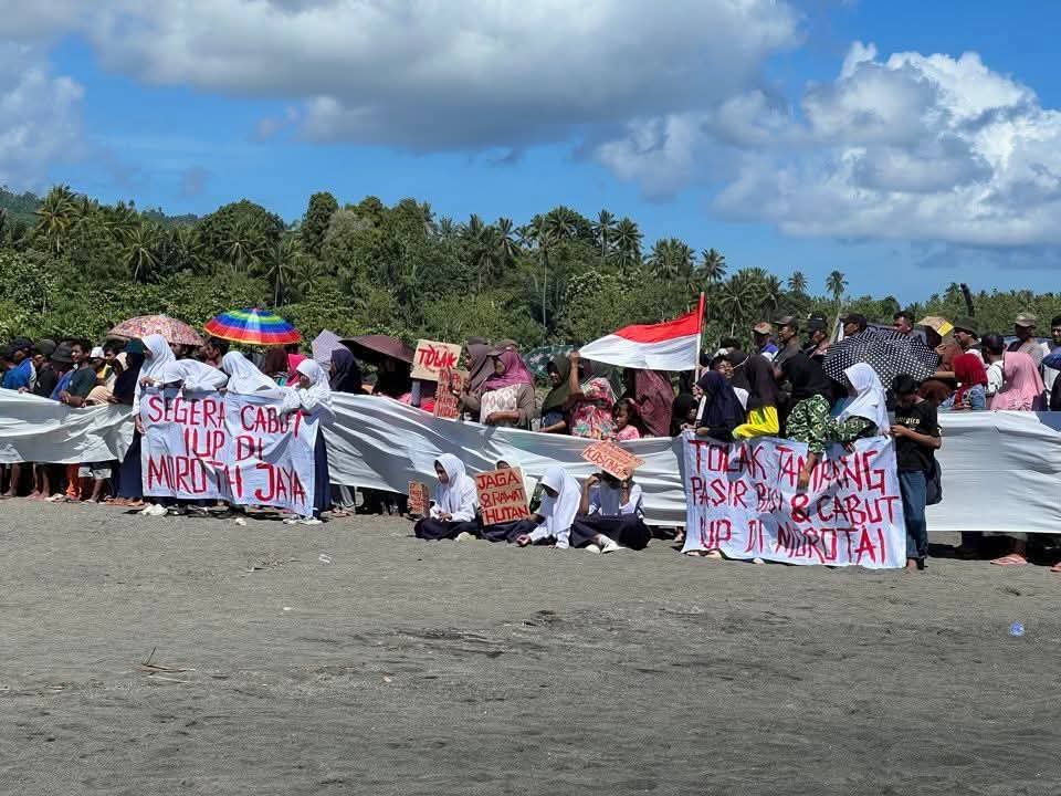 MALUTTIMES – Ratusan warga Desa Pangeo, Kecamatan Morotai Jaya, Kabupaten Pulau Morotai, Maluku Utara, bersama masyarakat dari desa sekitar menggelar aksi menolak kehadiran dua perusahaan tambang pasir besi yang akan beroperasi di wilayah mereka, Sabtu (18/10/2025).