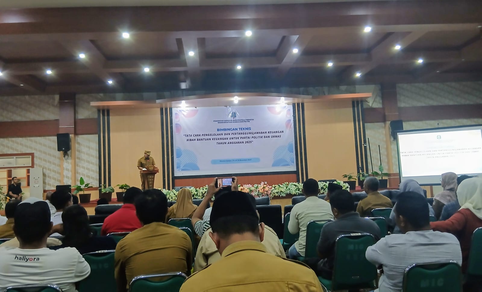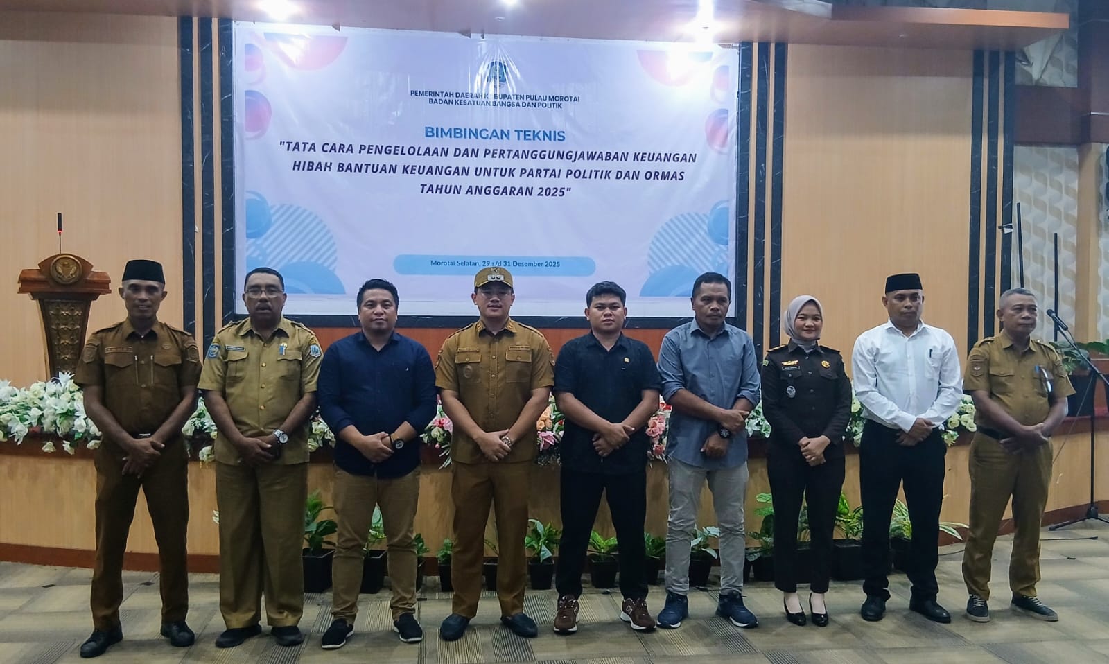 MALUTTIMES – Pemerintah Daerah (Pemda) Kabupaten Pulau Morotai melalui Badan Kesatuan Bangsa dan Politik (Kesbangpol) menggelar Bimbingan Teknis (Bimtek) pengelolaan dan pertanggungjawaban keuangan hibah, bertempat di Aula Lantai II Kantor Bupati Pulau Morotai, Senin (27/12/2025).