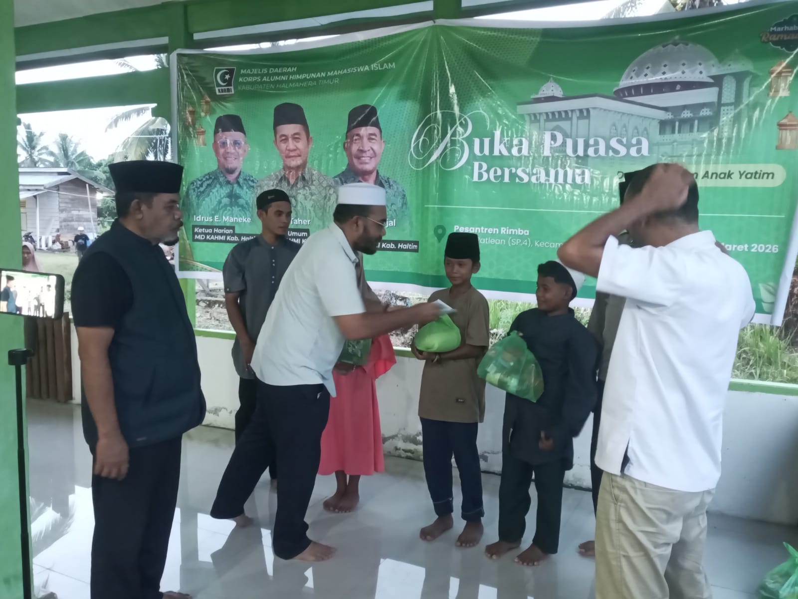 MALUTTIMES – Majelis Daerah Korps Alumni Himpunan Mahasiswa Islam (MD KAHMI) Halmahera Timur menggelar buka puasa bersama (bukber) sekaligus memberikan santunan kepada anak yatim dan santri Taman Pendidikan Al-Qur’an (TPQ) Pondok Pesantren Rimba, Kecamatan Maba Utara, Kabupaten Halmahera Timur, Maluku Utara, Senin (16/03/2026).