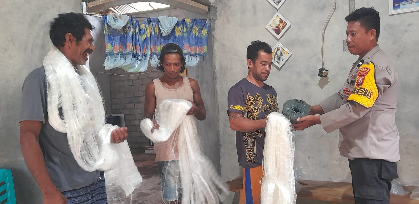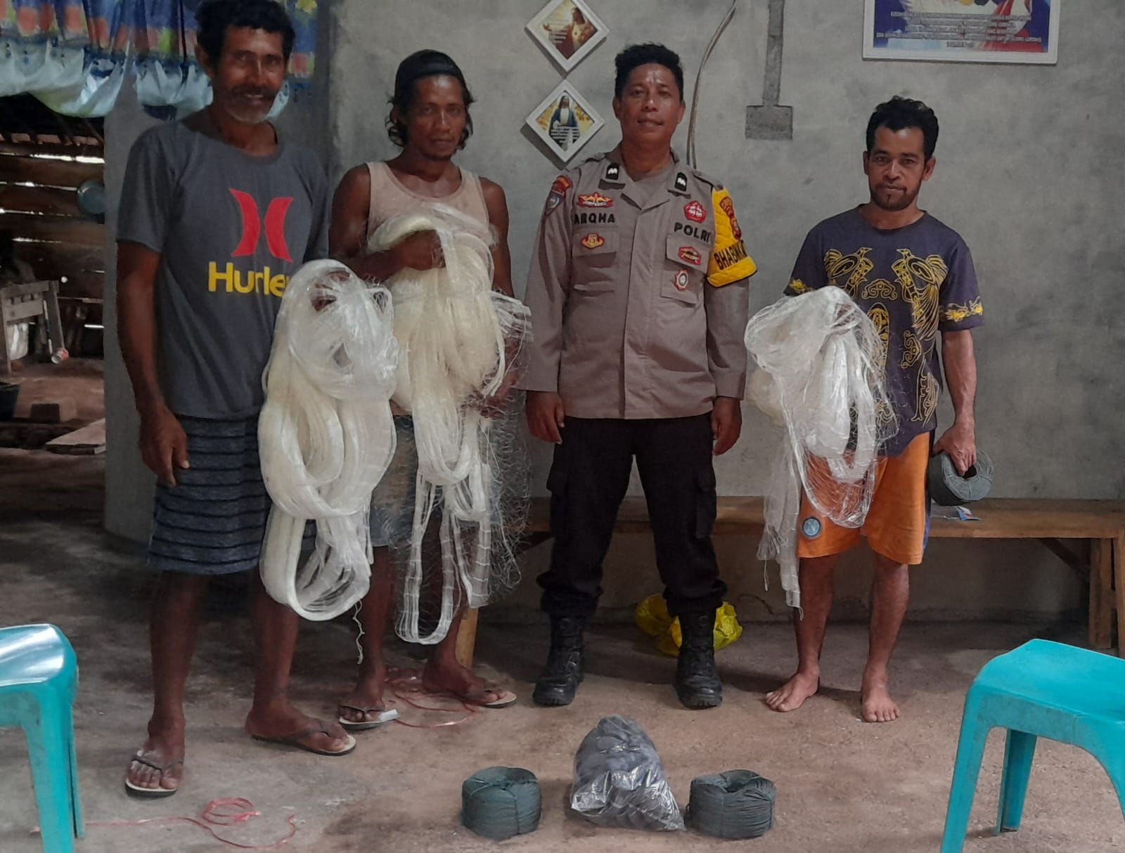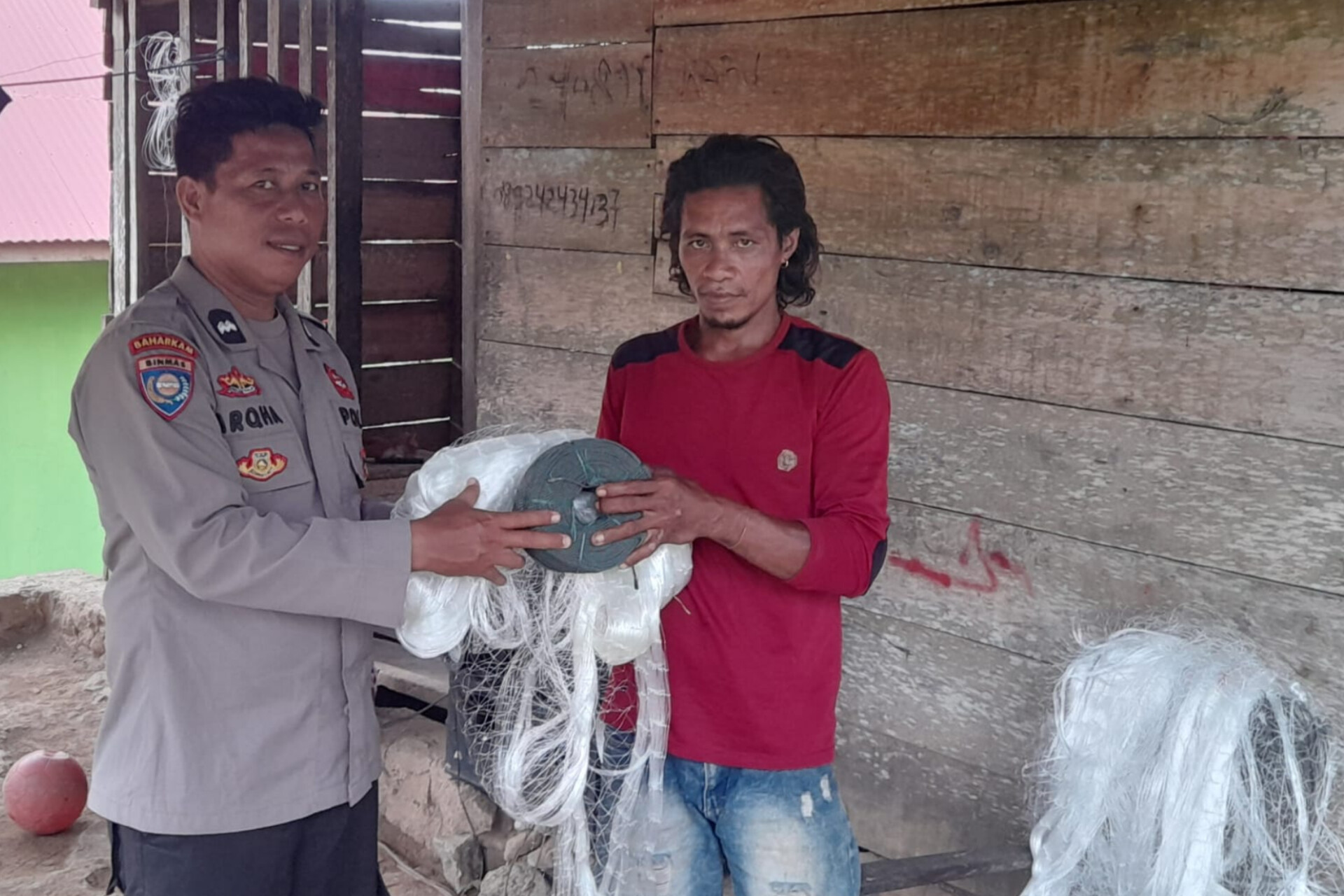 Dalam kegiatan yang berlangsung sekitar pukul 11.00 WIT itu, Bhabinkamtibmas menyerahkan bantuan alat tangkap berupa jaring kepada warga yang berprofesi sebagai nelayan di Desa Pasir Putih.